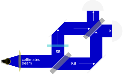 Setup where a beam is split into 2 through the use of a Beam splitter gate, we apply a phase shift on one of the beams relative to the other. The interference pattern caused by the phase shift can be observed by the patterns seen in the distribution of particles arriving at each detector.